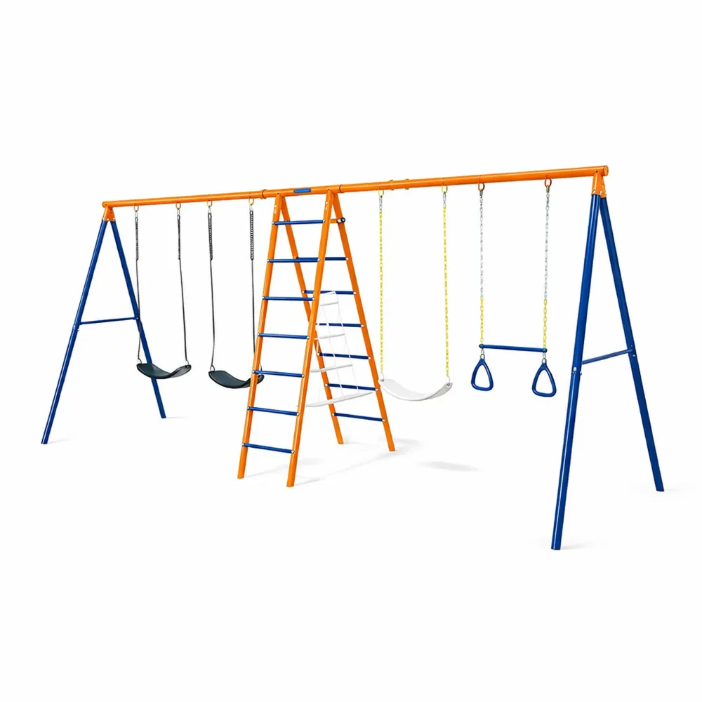 Cet ensemble de balançoire offre six options de jeu, incluant des balançoires, un trapèze, une échelle, un filet d'escalade et un panier de basket. La conception permet à plusieurs enfants de s'amuser en même temps. Fabriqué avec une structure métallique robuste, il est conçu pour assurer sécurité et durabilité. Les poignées et les surfaces sont conçues pour résister aux éléments extérieurs. Les composants en tissu sont traités contre les UV pour prolonger leur durée de vie. Facile à assembler, cet ensemble encourage le jeu actif en plein air.