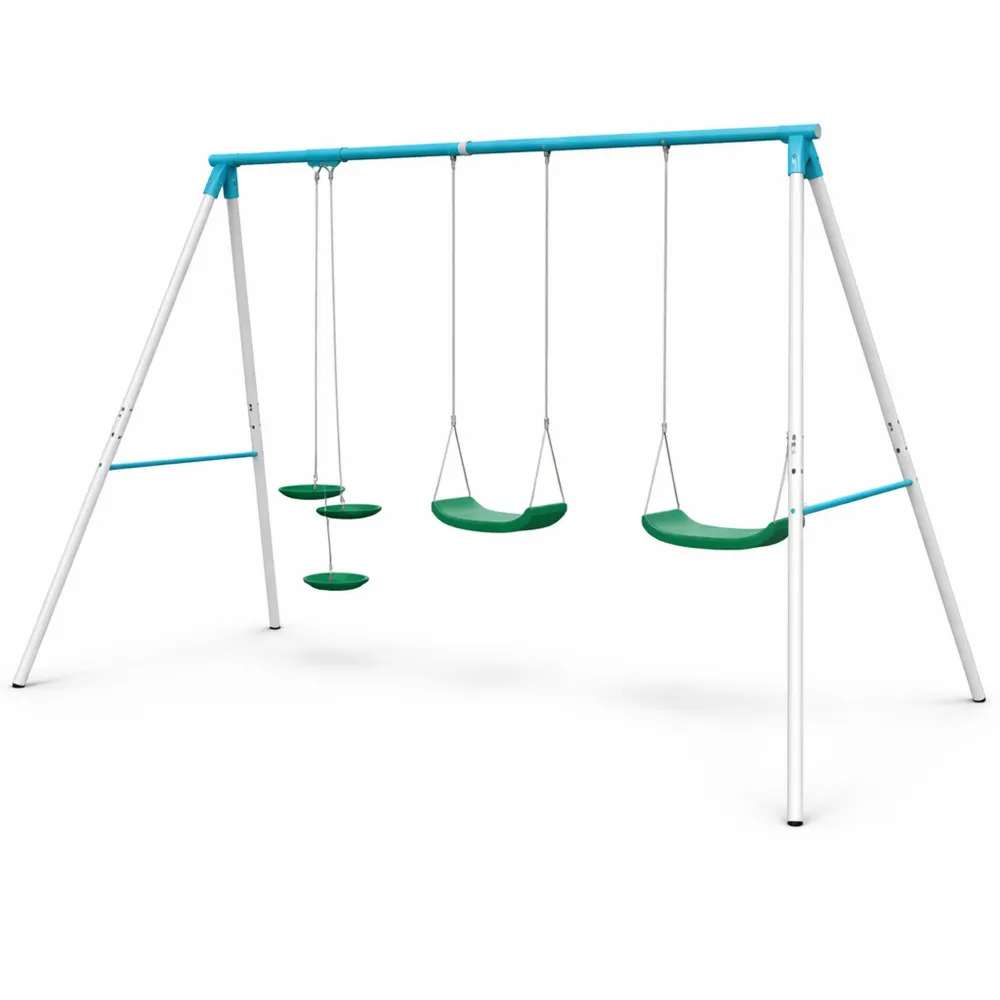 Balançoire pour jardin avec capacité de jeu pour 4 enfants, adaptée aux âges de 3 à 8 ans. Composée de métal galvanisé avec une peinture en poudre. Inclut deux balançoires avec sièges en plastique et un vis-à-vis avec repose-pieds. Facile à monter et démonter. Conçue pour résister aux conditions extérieures.