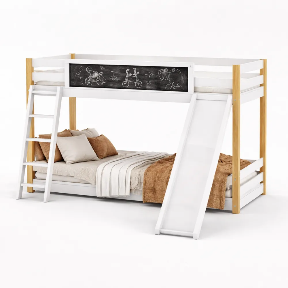 Ce lit superposé pour enfants est équipé d'un escalier et d'un toboggan intégrés, offrant une expérience ludique et fonctionnelle au coucher. Le toboggan modulable permet d'ajuster la position selon les préférences, créant ainsi un espace de jeu dynamique. Un tableau inclus permet des activités comme le dessin et l'écriture, favorisant l'apprentissage et l'expression artistique. Ce lit optimise l'espace disponible dans une chambre d'enfant, avec un espace en dessous qui peut être utilisé pour jouer ou se détendre. La construction solide assure une utilisation stable et sûre avec des couchages fiables 90x190 cm au-dessus et 90x200 cm en bas.